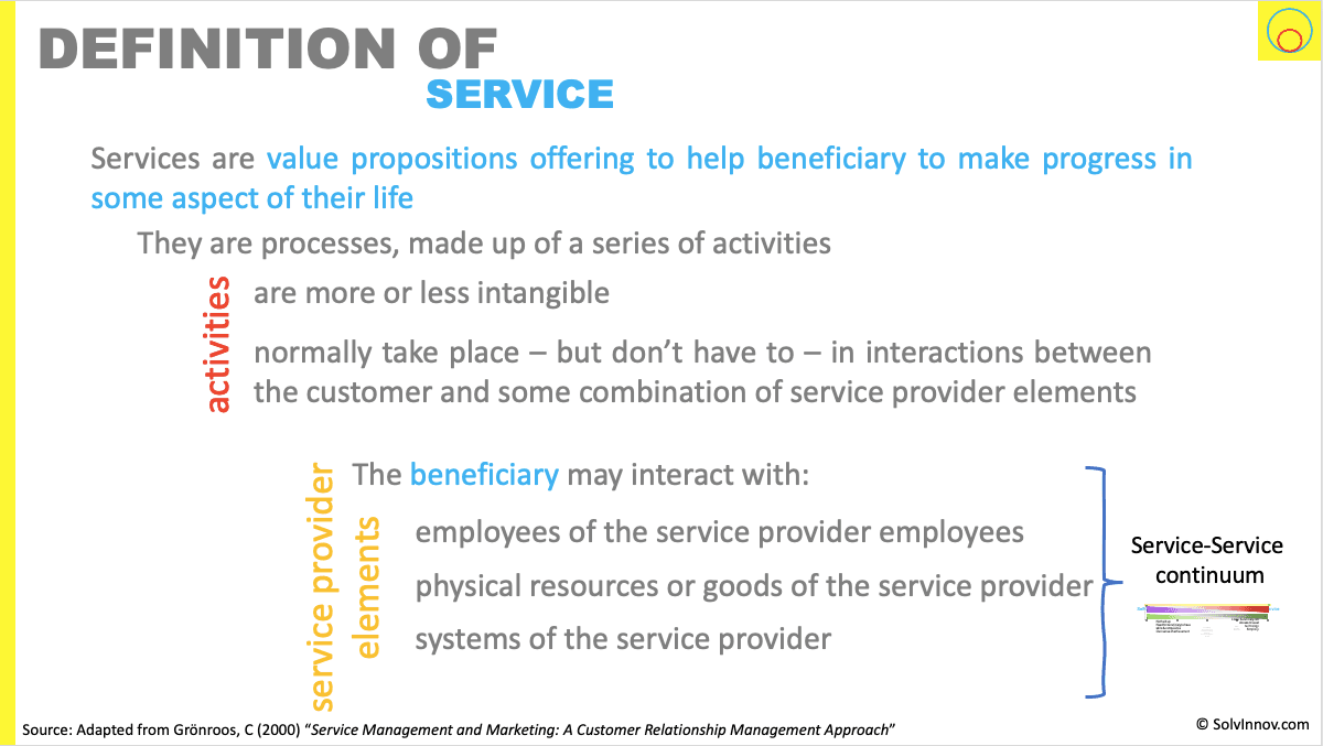 And this is actually baked in to our definition of service. Where the last part identifies the service mix. A source of innovation is altering that mix. For example, moving from a goods based mix, that typically indicates an element of self service on the beneficiary’s side. To a mix that has more of the other elements.