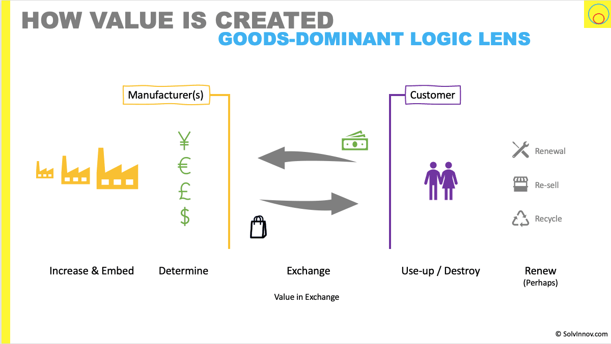 The alternative – which is how we are taught to view the world – is a lens where we see goods are exchanged for value. This lens focuses heavily on that point of exchange. And that challenges innovation and growth in several ways, including that it is not relational, the producer feels they determine value, they become myopic in improving offerings (the ” one more razor blade “ problem) and they miss post-sales opportunities, including the circular economy.