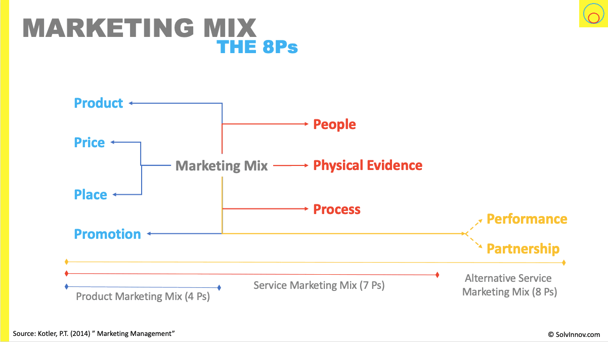 In alternative Service Marketing Mixes, there is an 8th P added. Two of the more common are Kotler’s, where this P is for performance; and another where the P is for partnership.