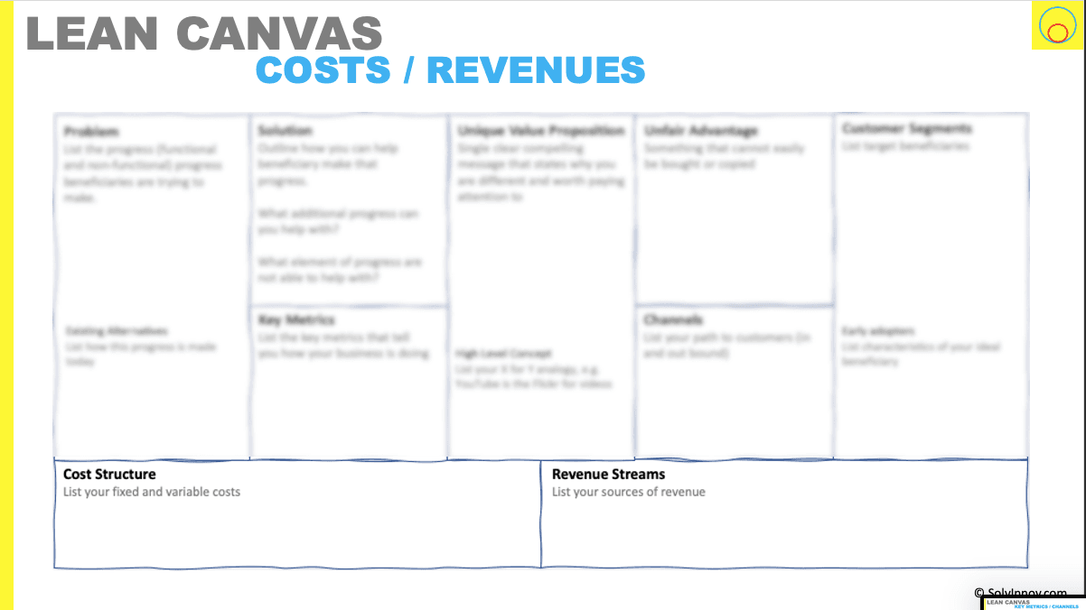 Completing the Lean Canvas segments are segments for cost structure and revenue streams. I’ve often seen ideas in ideation that you can tell are commercially unviable. But I would propose for ideation purposes these two segments are useful to get an insight, but a heavy emphasis should not be placed on them initially. Otherwise, you risk stalling ideation as ideators worry about these aspects; and business risks focussing on them.