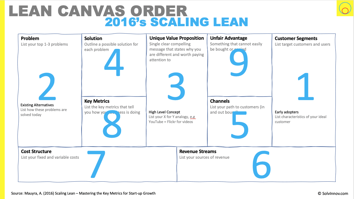 The original, 2012, “Running Lean” book proposed the order shown in Figure 11. Starting with the problem, then customer segments, and then unique value proposition, the solution is 4th and so on.