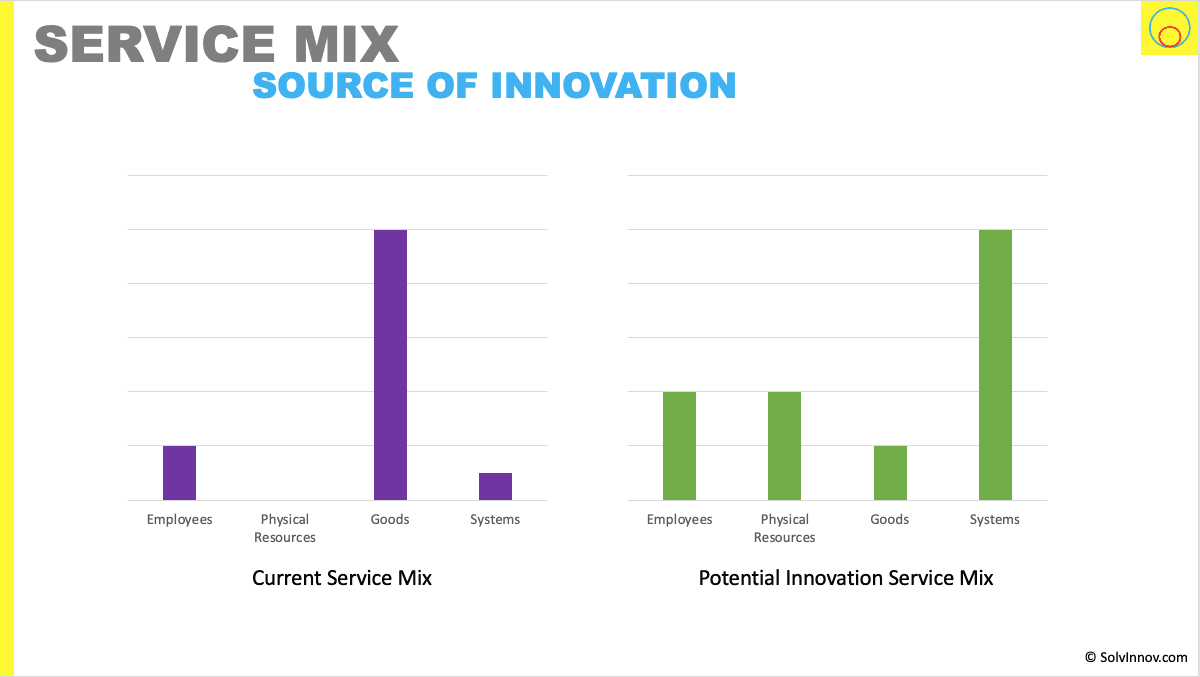 Altering how much provision of each element for any particular service is a source of innovation. You can see this as a toy example in Figure 3. Where we are planning on reducing the focus on goods in the current service mix to one where employees and physical resources play a bigger part. And where systems are much more important.